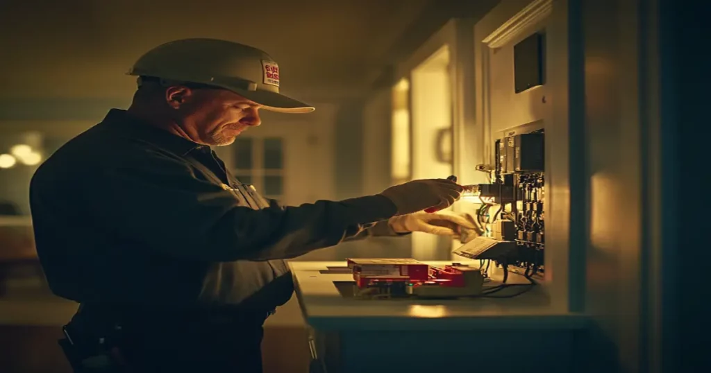 Close-up shot of an electrician’s hands from Mr Dee’s Electric Service carefully repairing a circuit breaker in a residential setting